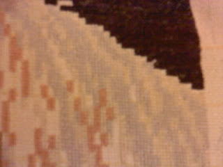 Worked with a little bit of white today (image entitled smalldetail1), but more importantly I finished working with that lovely shade of grey. That came about for two reasons - firstly these are (nearly) all the symbols of this shade on the gobelin and secondly (and may I add more importantly and more annoyingly) I ran out of thread!!! I only have one symbol of this shade of grey to do, yet I do not have a thread for it. You can see that on the image (entitled smalldetail2). I now have to work on all the other symbols, fill them in, see what shade of grey I have left and try and use the one that is the closest match. Not ideal, but this will have to be the case. At least, when the gobelin is finished and I look at it I can always see if this is the one I created - as it will always have this quirky side to it that no one else's (who fully followed the pattern) will. As they say: